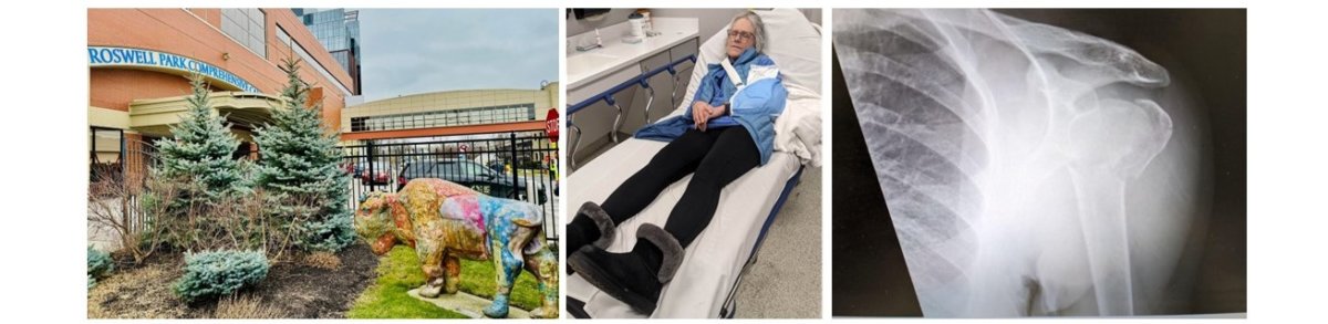 However, while Steve was in Roswell getting scanned, Sheryl was walking Luci around the block. As she paused to admire one of Buffalo's many colorful buffaloes, she stumbled and fell full weight on her left shoulder. She was in excruciating pain, and the Roswell staff kindly shuttled us over to the Buffalo General ER where Sheryl got her very own CT scan along with some x-rays. They sent us home with the news that Sheryl had sustained 2 fractures to her humerus (there's nothing funny about that). We met with our very fine local orthopedic surgeon (who specializes in shoulders) who is scheduled to patch Sheryl up this Friday, Feb 09 -- a plate and a few screws should do the trick. He assures her that she will have sufficient range of motion to continue skiing and cycling.