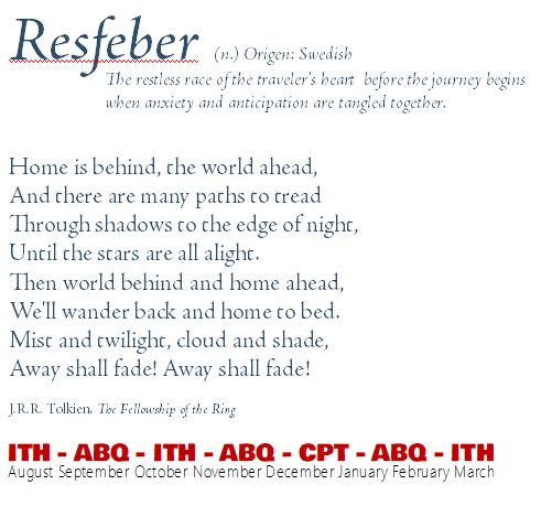 But also our Froehlich adventure to Albuquerque and South Africa. A newly discovered Swedish word captures perfectly how we are feeling in this moment, Resfeber. |